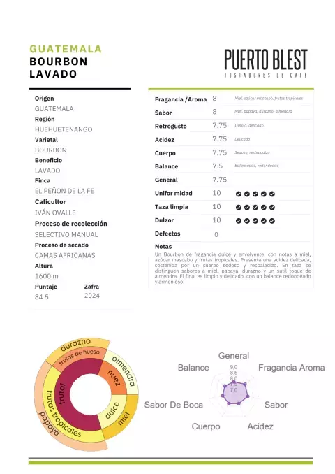 Este Bourbon lavado nace en la finca El Peñón, en la región montañosa de Huehuetenango, Guatemala, a 1.600 metros de altura. Su fragancia es tropical y envolvente, con delicados matices de miel, azúcar mascabo y frutas maduras.