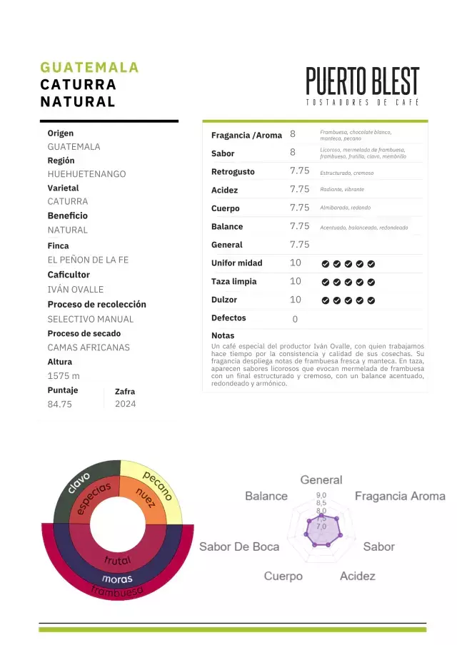Este Caturra natural nace en la finca El Peñón, en la región montañosa de Huehuetenango, Guatemala, a 1.575 metros de altura. Su fragancia es intensa y seductora: combina la frescura de la frambuesa con la suavidad del chocolate blanco y la calidez de las nueces pecán.